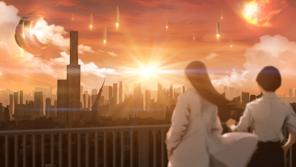 Original character and scene CGs bring the world to life, from crumbling cities and rooftop dinners to asteroid landfalls and sacrifices beneath a burning sky.